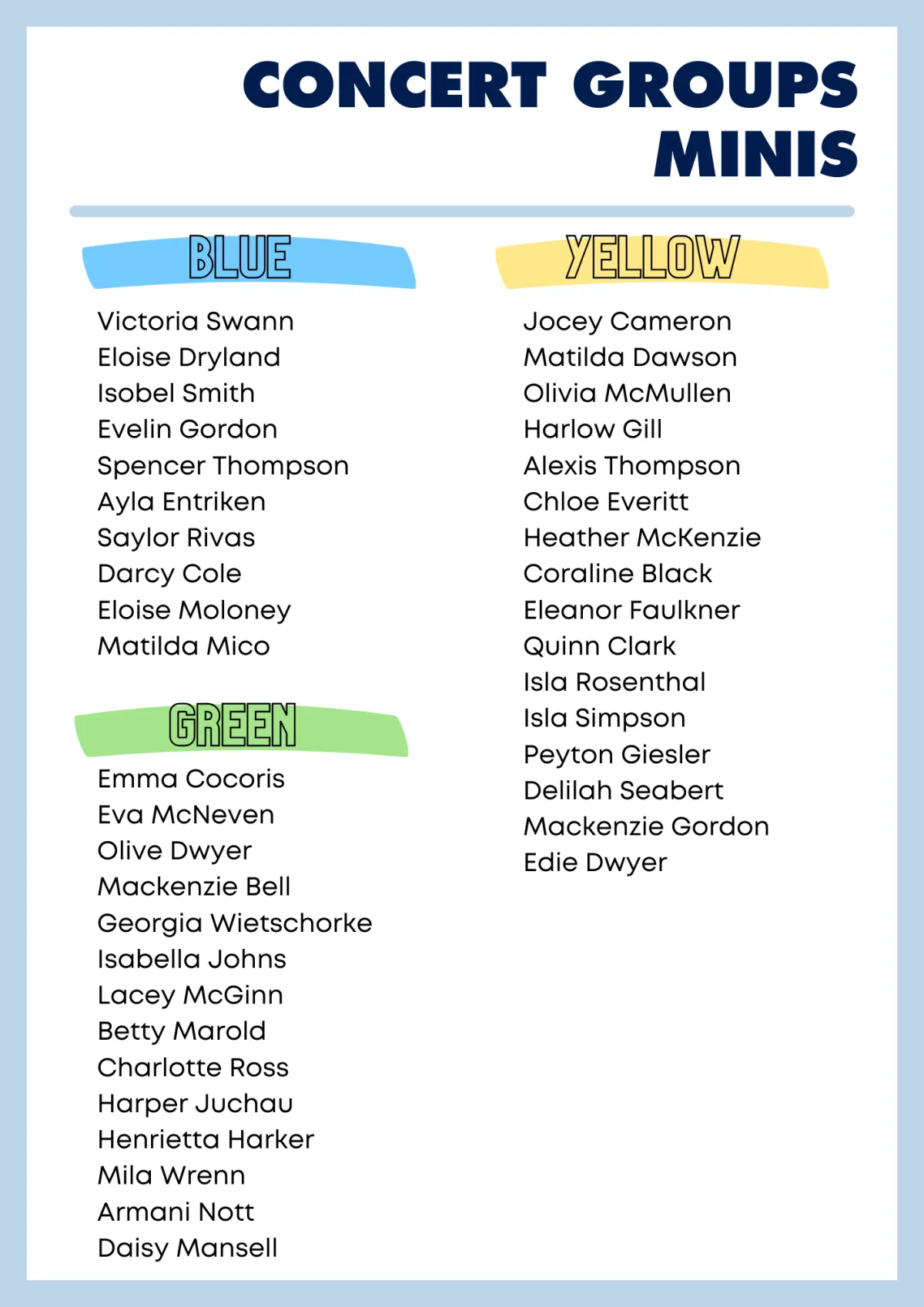 On both concert and dress rehearsal days, all students will remain in the dressing room until it's their time to shine on stage. To help everything run smoothly, each student will be assigned to a specific coloured group in the dressing room.